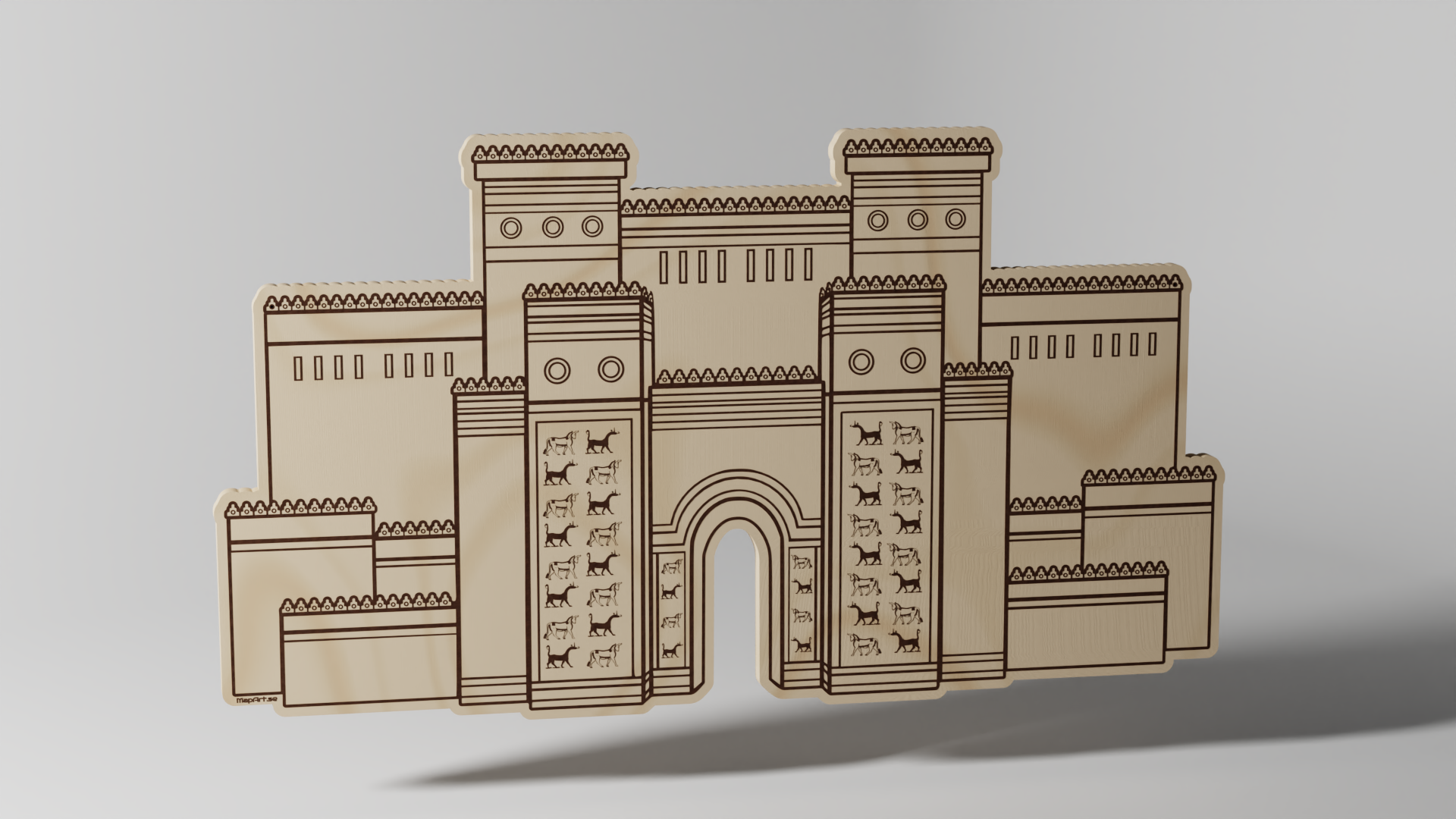 Denna väggdekoration föreställer den mäktiga Ishtarporten, en av de mest kända symbolerna från det forntida Babylon. Porten står för styrka, stolthet och kulturarv, och påminner om en tid då Babylon var hjärtat av kunskap, skönhet och civilisation.